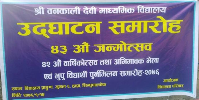 श्री वनकालि देवि माध्यामिक विध्यालको ४३औ जन्मोत्सब ४२ औ बार्षिकोत्सब एवम भुपु बिध्यार्थि पुर्नमिलन समारोह २०७६ हुने भयको छ ।