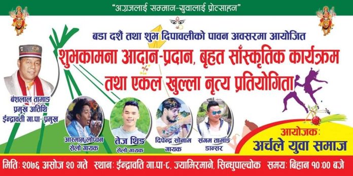 सिन्धुपाल्चोक जिल्लाको इन्द्रावति गाउँ पालिकाका प्रमुख बंशलाल तामाङको प्रमुख आतिथ्यतामा बृहत् सांस्कृतिक कार्यक्रम सम्पन्न हुने छ ।