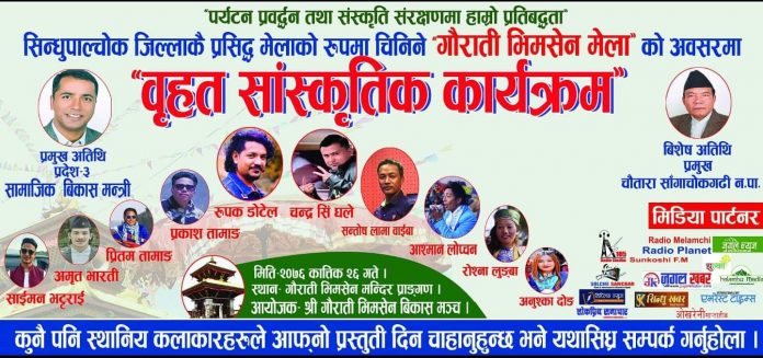 सिन्धुपाल्चोक जिल्लाकै प्रशिद्ध धार्मिक मेला लाग्ने गौरति भिमेश्वर मेलामा बृहत् सांस्कृतिक कार्यक्रम हुने भयको छ ।