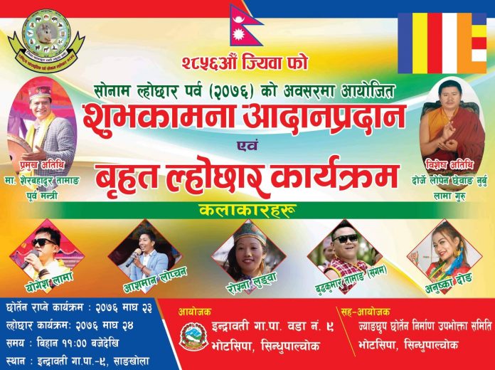 २८५६ औं जिवा ल्हो सोनाम ल्होछारको सबैलाई शुभकामना दिदै ल्होछारको अवसरमा आयोजित ल्होछार कार्यक्रममा सबै वडाबासि गाउँबासि एवम सिन्धुबासिमा उपस्थिति भई कार्यक्रमको शोभा बढाईदिन समेत आयोजकले अनुरोध गरेका छन ।