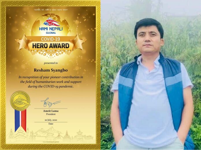 यो कोभिड १९ महामारि र प्राकृतिक प्रकोपको असहज परिस्थितिमा अप्ठ्यारामा परेकाहरुलाई सहयोग गरेको भन्दै नेपाल तामाङ घेदुङ सिन्धुपाल्चोकका अध्यक्ष एवम नेकपाका युवा नेता रेशम स्याङबोलाई हामी नेपाली ग्लोबल नामक अन्तराष्ट्रिय संस्थाले हिरो अवार्ड प्रदान गरेको छ ।
