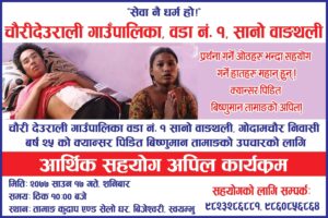 चौरी देउराली गाउपलिका वाडा १ का युवाहरूको पहलमा सङ्कलन गरिएको रकम एक लाख छब्बिस हजार आठ सय असी ( रु१,२६,८८०) रुपैयाँ क्यान्सर पीडित बिष्णु तामाङलाई हस्तान्तरण गरेको छ ।